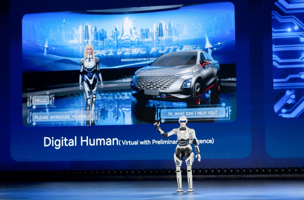 圖為奇瑞墨甲機器人“墨茵”登臺演講