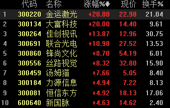 元宇宙概念持續沖高,金運激光(22.980,3.83,20.00%)、大富科技(14.400,2.40,20.00%)拉升封板。