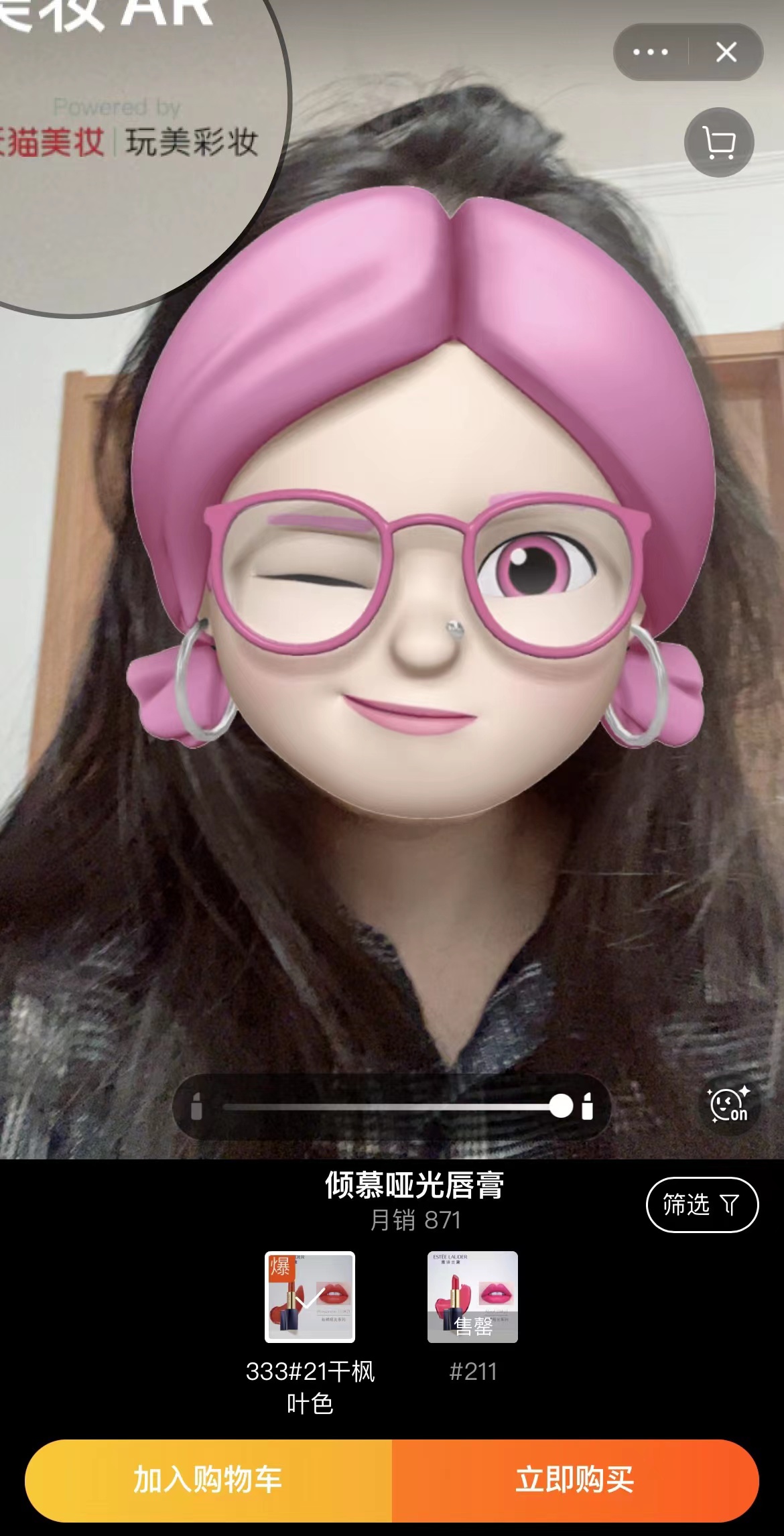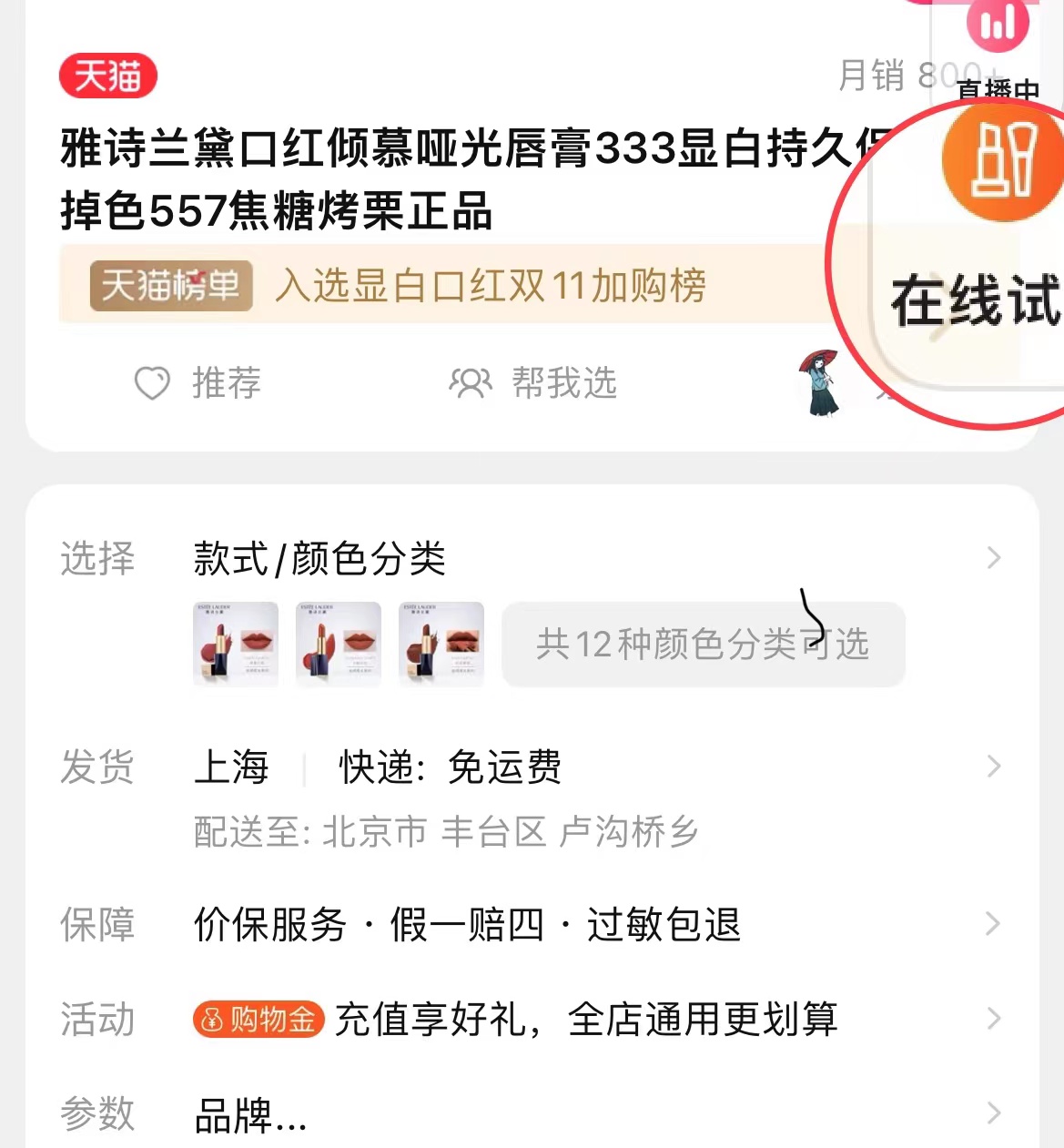 如何吸引?例如,記者搜索發(fā)現(xiàn)天貓部分彩妝旗艦店提供“線上試妝”服務。在雅詩蘭黛旗艦店的一款口紅頁面,試著點擊在線試妝后,可以滑動相關按鈕,查看該色號的涂抹效果。而頁面左上角則顯示該技術屬于“玩美彩妝”。