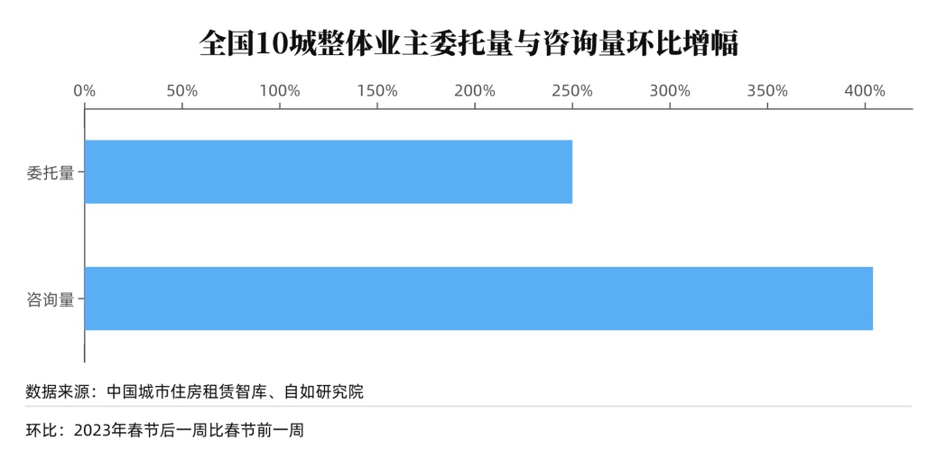 伴隨著長租市場需求側的火熱,長租機構也吸引了更多業主進行委托管理。數據顯示,環比春節前一周,2023年春節后第一周全國10城長租機構業主咨詢量較春節前增長超4倍、業主委托量增長2.5倍。