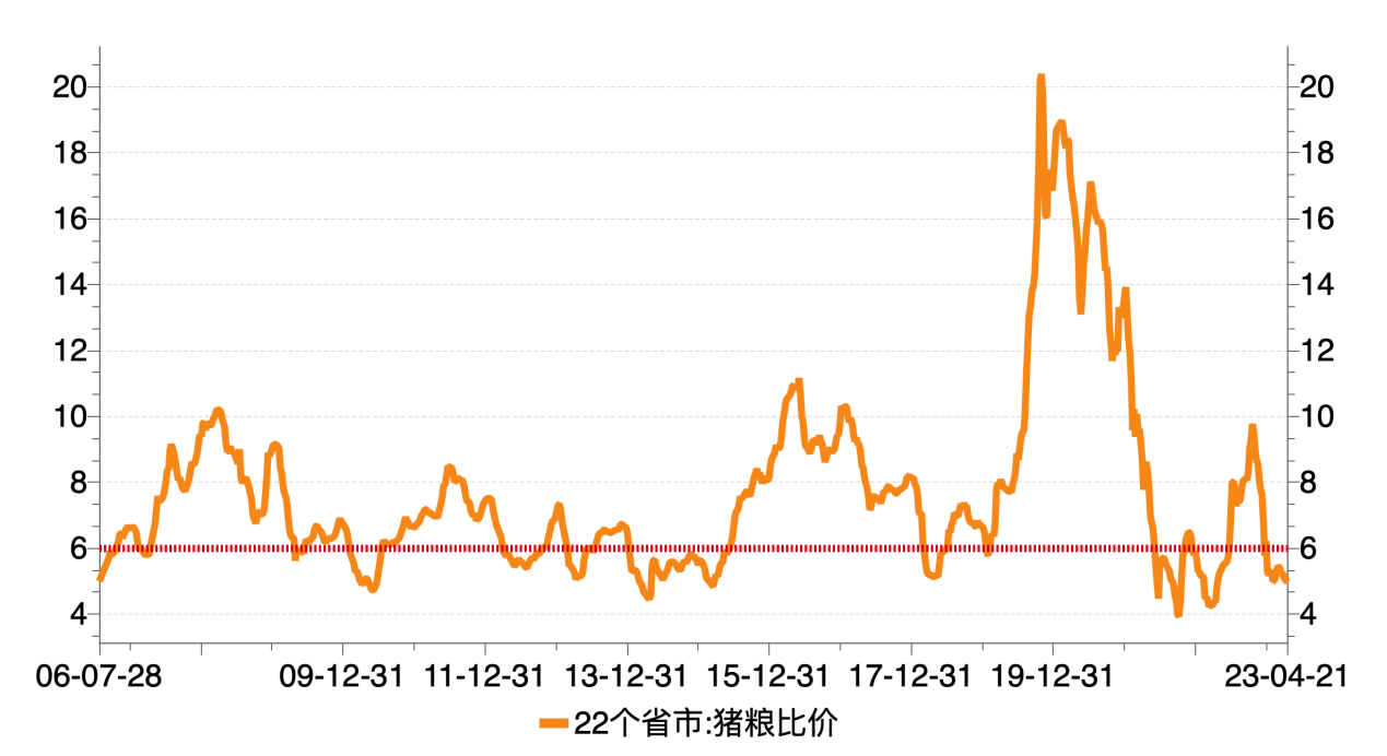 在供給端,短期來看,盡管2023年初以來的豬糧比持續(xù)在6以下區(qū)間運行(見圖5),生豬養(yǎng)殖持續(xù)虧損,但養(yǎng)殖端的扛價意愿較強,能繁母豬數(shù)量未出現(xiàn)大幅壓降,壓欄和二育有抬頭的趨勢,豬肉的供給壓力被后置。從歷史的規(guī)律來看,能繁母豬數(shù)量與豬肉價格成反比,能繁母豬數(shù)量高企時,豬肉價格通常處于低位(見圖6)。雖然當(dāng)前能繁母豬數(shù)量仍然處于高位,但中長期來看,能繁母豬數(shù)量有望隨著豬價的觸底回升而減少,連鎖反應(yīng)將導(dǎo)致供給端出現(xiàn)相應(yīng)收縮。