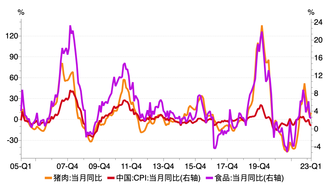 圖8:豬肉價格與食品、CPI三者的同比增速具有明顯相關(guān)性