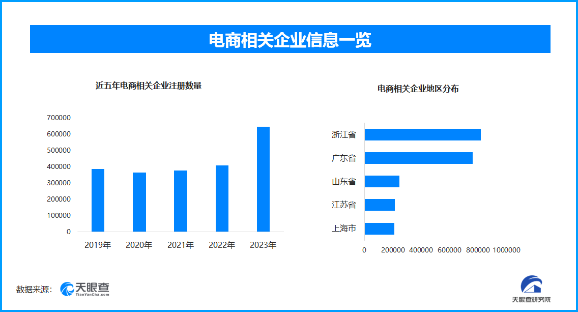 天眼查專業版數據顯示,截至目前,全國目前現存在業、存續狀態的電商相關企業約為375.5萬家,其中,2024年1月份-10月份新增注冊企業59.6萬余家;從電商企業年度注冊量可以看出,近5年來,電商相關企業注冊量一直保持高位增長,并于2023年達到頂峰。從地域分布來看,浙江省與廣東省兩個大省并駕齊驅位列榜首,注冊量分別為81.9萬家和76.2萬家;山東省、江蘇省、上海市位列其后,均為20萬家左右的量級。