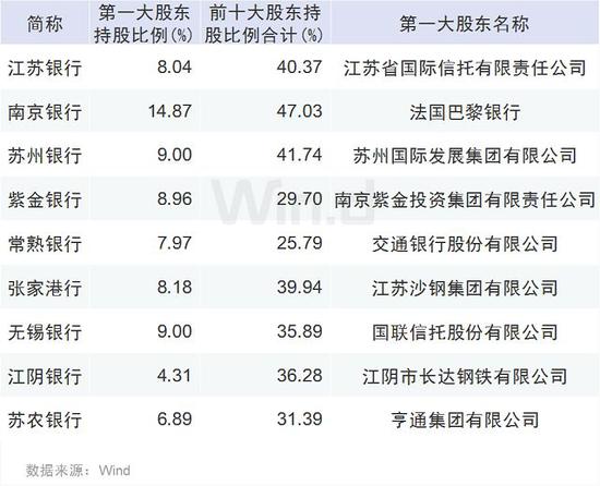 值得關注的是,江蘇A股上市的9家銀行當中,均無控股股東和實際控制人,除南京銀行(7.830,0.11,1.42%)第一大股東法國巴黎銀行持股比例為14.87%外,其他8家銀行第一大股東持股比例均低于10%,且從前十大股東持股比例合計來看,均小于50%,如紫金銀行(6.270,0.10,1.62%)、常熟銀行(7.820,0.02,0.26%)前十大股東持股比例合計甚至不到30%。