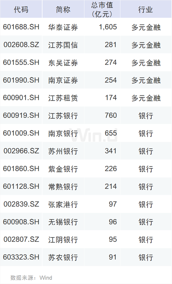 從目前上市公司情況來看,江蘇共有14家金融類上市公司,9家銀行及5家多元金融企業(包括證券、信托、金融租賃)。從相關公司總市值來看,除華泰證券(19.650,0.29,1.50%)超過1000億元以外,其余公司總市值相對較低,此外,還有4家農商行總市值不足100億元。