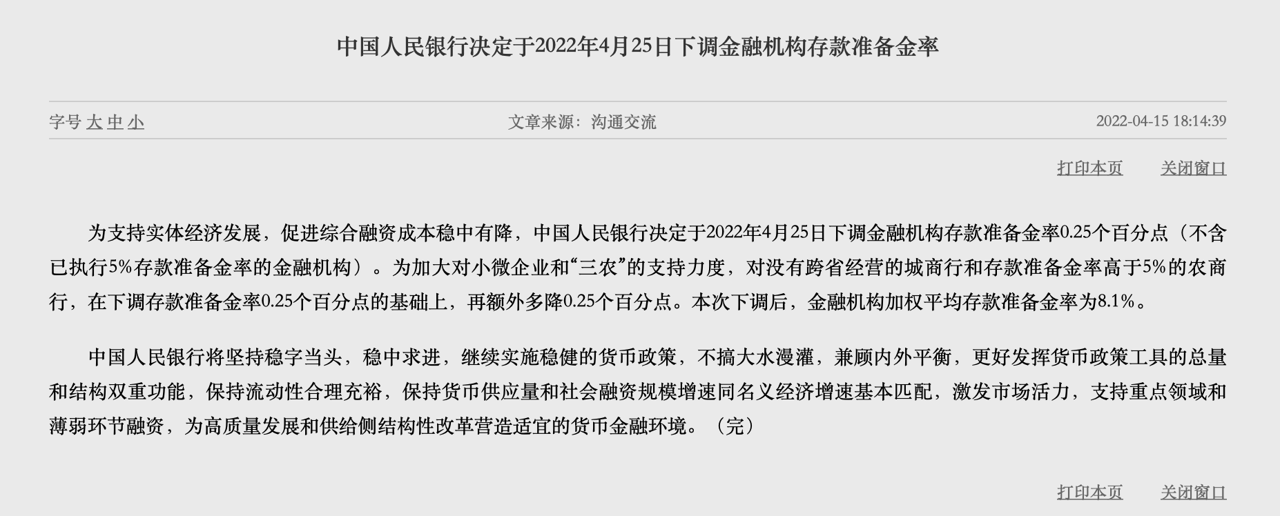 央行決定于4月25日降準0.25個百分點2022-04-15 19:05