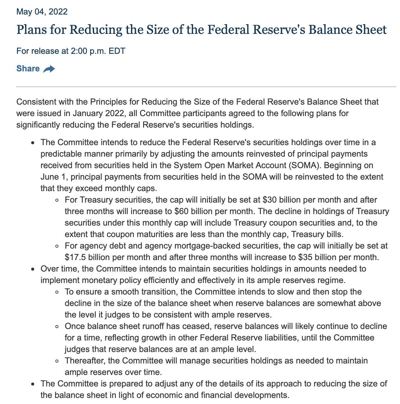 另外,據美聯儲FOMC聲明顯示,委員會決定從6月1日開始減少其持有的國債、機構債務和機構抵押貸款支持證券。根據縮表計劃,美聯儲將從6月開始以每個月475億美元的速度縮表,其中美債300億元美元,機構債務和機構抵押貸款支持證券為175億美元;三個月之后,每個月的縮表力度將擴大至最高950億美元,其中美債600億元美元,機構債務和機構抵押貸款支持證券為350億美元。