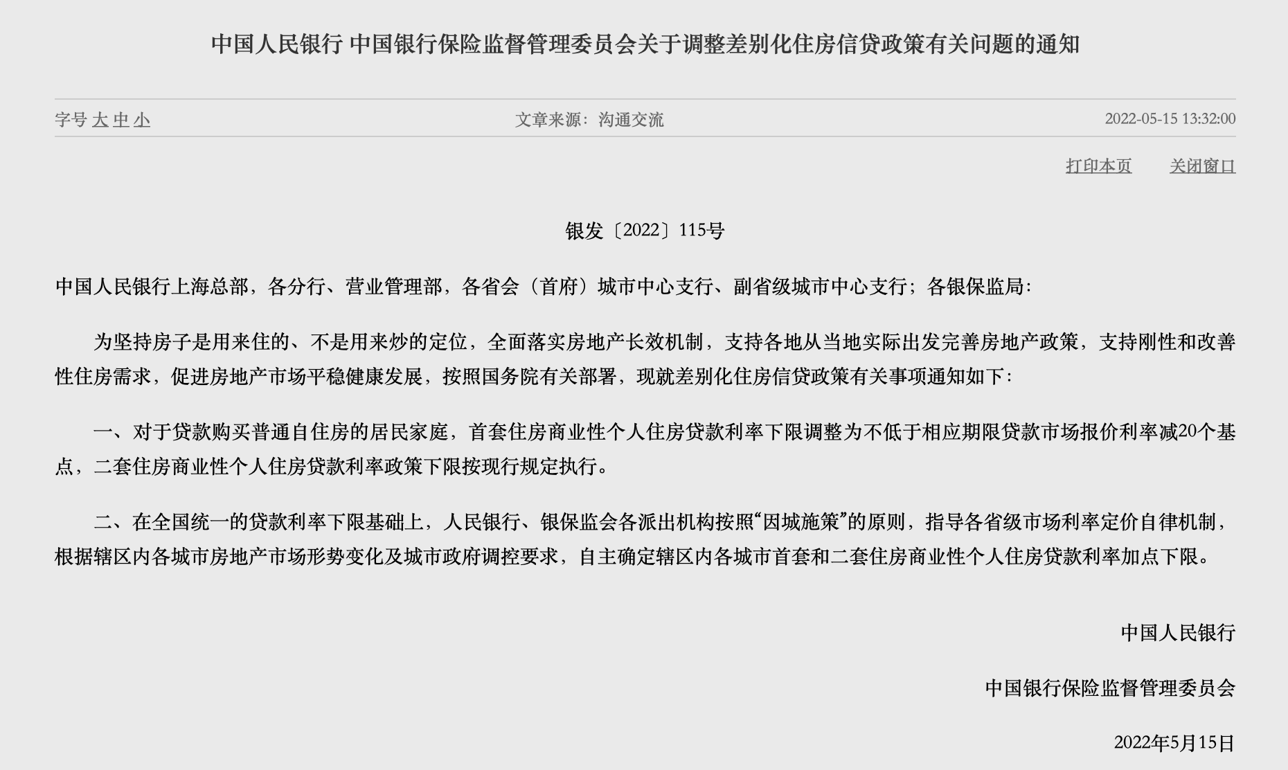 5月15日,央行、銀保監(jiān)會聯(lián)合發(fā)文稱,對于貸款購買普通自住房的居民家庭,首套住房商業(yè)性個人住房貸款利率下限調整為不低于相應期限貸款市場報價利率減20個基點,二套住房商業(yè)性個人住房貸款利率政策下限按現(xiàn)行規(guī)定執(zhí)行。
