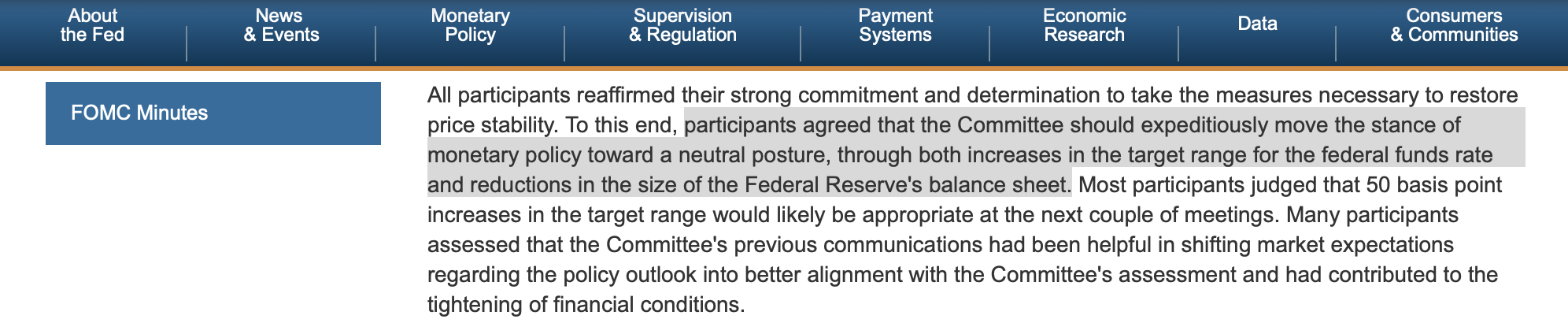 會議紀要顯示,在考慮貨幣政策的適當立場時,所有與會者一致認為,美國經濟非常強勁,勞動力市場極其緊張,通貨膨脹非常高,遠遠高于委員會2%的通貨膨脹目標。在此背景下,所有與會者一致認為,在本次會議上將聯邦基金利率的目標范圍提高50個基點是適當的,6月1日開始縮減美聯儲資產負債表的規模是合適的。