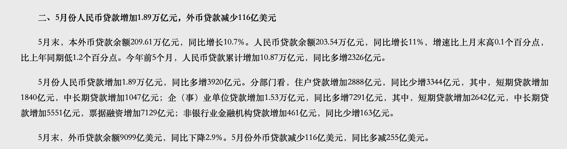 具體來(lái)看,5月份人民幣貸款增加1.89萬(wàn)億元,同比多增3920億元。