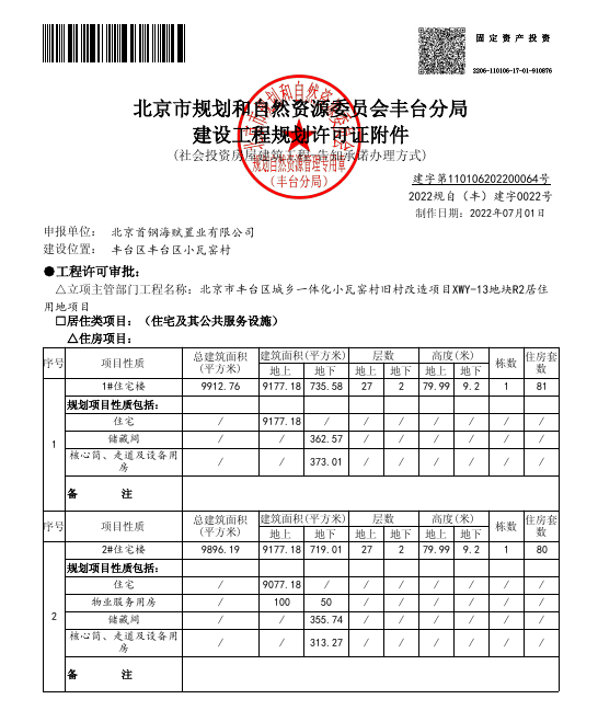 北京首鋼海賦置業有限公司于2022年6月1日通過掛牌出讓形式取得豐臺區小瓦窯村XWY-13地塊項目建設用地使用權,拿地后僅30天就取得了建設工程規劃許可證,繼華潤置地紀家廟項目后,再次刷新了豐臺區集中供地以來辦理建設工程規劃許可證的記錄。