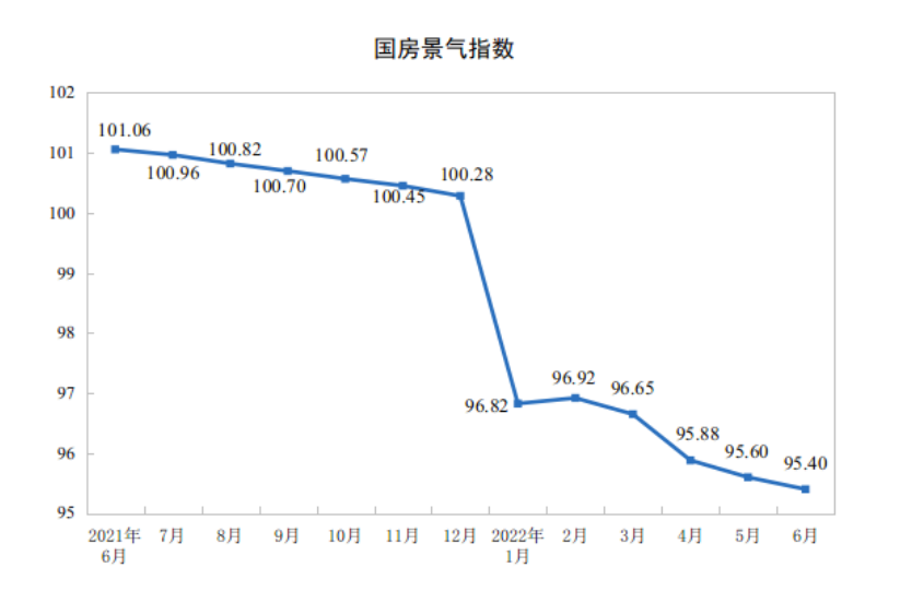 6月份,房地產(chǎn)開(kāi)發(fā)景氣指數(shù)(簡(jiǎn)稱“國(guó)房景氣指數(shù)”)為95.40。