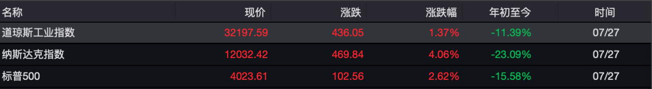 此次加息落地后,美股尾盤出現較大拉升。截至當地時間7月27日收盤,道瓊斯指數收報32197.59點,上漲1.37%;納斯達克指數收報12032.42點,上漲4.06%;標普500指數收報4023.61點,上漲2.62%。但多位分析人士表示,對后續美股走勢仍持謹慎態度。