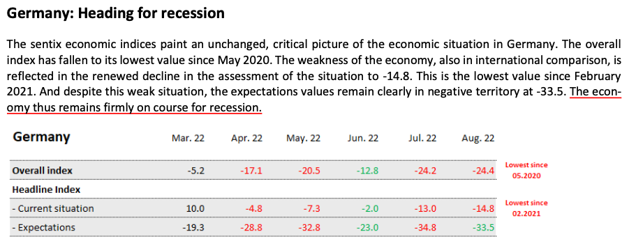 素有“歐洲經(jīng)濟(jì)火車頭”之稱的德國(guó),在此次調(diào)研中情況也不容樂觀。德國(guó)8月份投資者信心指數(shù)錄得-24.4,為2020年5月份來新低;投資者對(duì)經(jīng)濟(jì)現(xiàn)狀的信心指數(shù)錄得-14.8,較前值繼續(xù)下降1.8,為2021年2月份來新低。報(bào)告稱,“德國(guó)經(jīng)濟(jì)正在‘堅(jiān)定’走向衰退。”