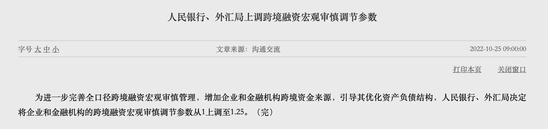 10月25日,中國人民銀行發布消息,為進一步完善全口徑跨境融資宏觀審慎管理,增加企業和金融機構跨境資金來源,引導其優化資產負債結構,人民銀行、外匯局決定將企業和金融機構的跨境融資宏觀審慎調節參數從1上調至1.25。