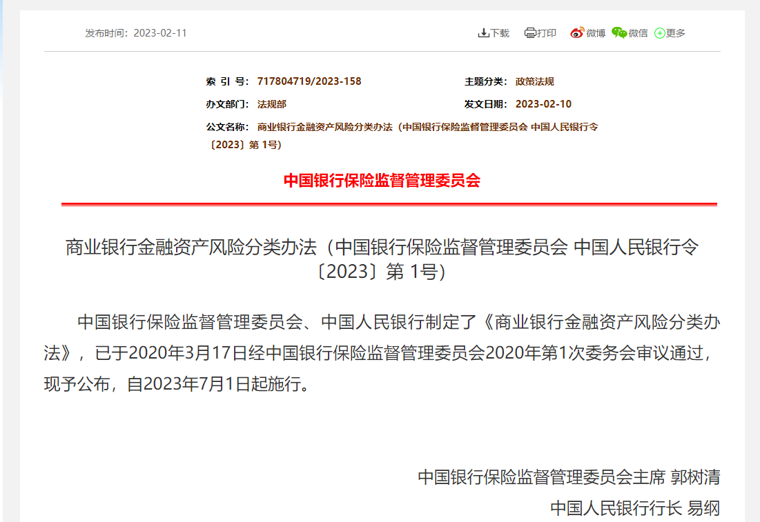 2月11日,由銀保監會、人民銀行聯合制定的《商業銀行金融資產風險分類辦法》(以下簡稱《辦法》)正式發布,以進一步推動商業銀行準確識別、評估信用風險,真實反映資產質量。