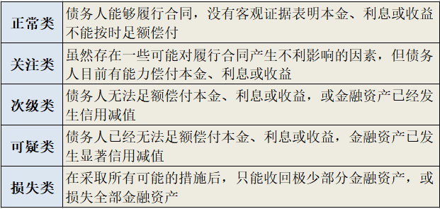 具體來看,金融資產按照風險程度分為五類,分別為正常類、關注類、次級類、可疑類、損失類,后三類合稱不良資產。(具體如下圖)