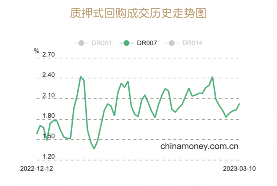 從資金價格來看,上周前四個交易日資金面延續前一周的寬松局面。據中國貨幣網數據顯示,3月6日DR007加權平均利率1.8253%,為本月以來最低,隨后開始向上。3月10日,DR007加權平均利率升至政策利率水平(2%)上方報2.0253%。
