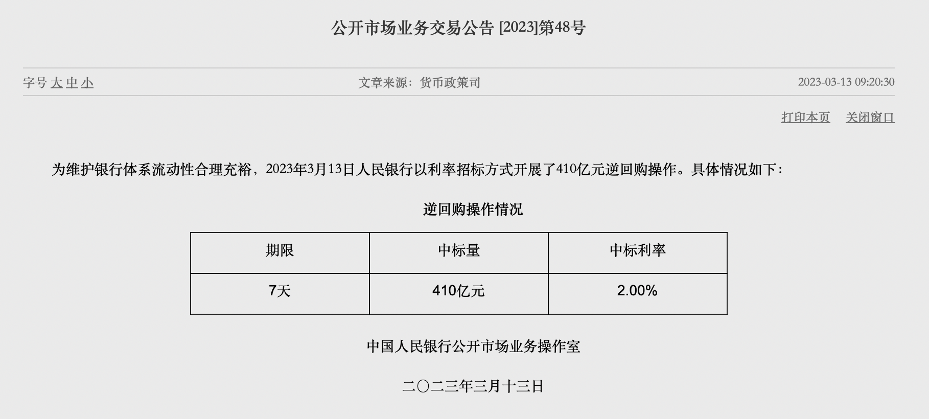 央行開展410億元逆回購操作 實現凈投放340億元2023-03-13 10:30