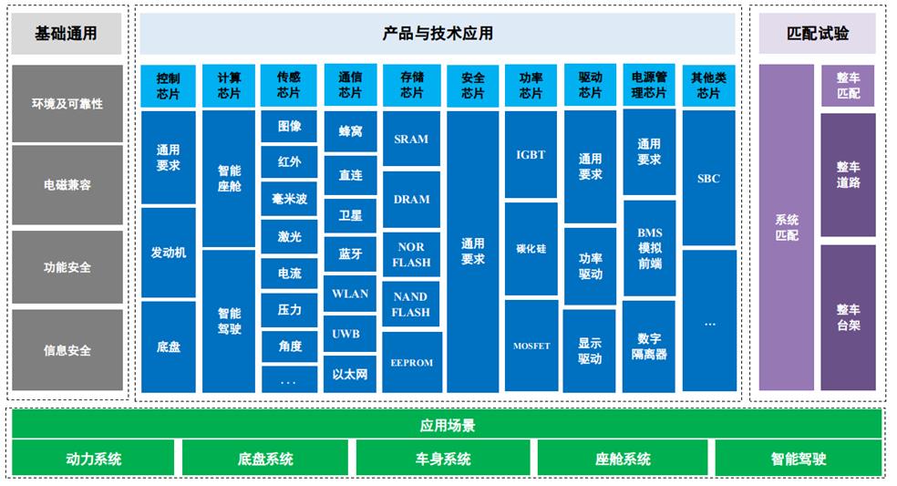 汽車芯片標(biāo)準(zhǔn)體系技術(shù)結(jié)構(gòu),以“汽車芯片應(yīng)用場(chǎng)景”為橫向出發(fā)點(diǎn),包括動(dòng)力系統(tǒng)、底盤系統(tǒng)、車身系統(tǒng)、座艙系統(tǒng)及智能駕駛五個(gè)方面;向上延伸形成基于應(yīng)用場(chǎng)景需求的汽車芯片各項(xiàng)技術(shù)規(guī)范和試驗(yàn)方法,根據(jù)標(biāo)準(zhǔn)內(nèi)容分為基礎(chǔ)通用、產(chǎn)品與技術(shù)應(yīng)用和匹配試驗(yàn)三類標(biāo)準(zhǔn)。