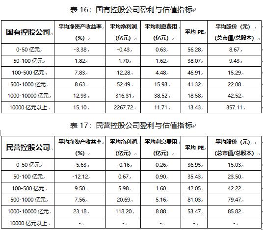 但是,對比國有控股公司和民營控股公司的盈利表現(xiàn)來看,我們發(fā)現(xiàn):(1)從平均凈資產(chǎn)收益率指標看,市值在100-500億元和1000-10000億元的兩類區(qū)間中(2022年底,民營控股公司沒有萬億市值以上的公司),國有控股上市公司的平均凈資產(chǎn)收益率都低于民營控股公司的相同指標,特別是在市值1000-10000億元的區(qū)間中,民營控股公司的平均凈資產(chǎn)收益率是國有控股公司系統(tǒng)指標的1.79倍。(2)從平均利息費用指標看,國有控股公司的利息費用在所有市值區(qū)間,都明顯公司高于民營控股公司,特別是,在市值500-1000億元的區(qū)間中,國有控股公司的平均利息費用15.93億元,民營控股公司的平均利息費用是5.16億元,前者是后者的3.09倍。在市值1000-10000億元的區(qū)間中,國有控股公司的平均利息費用是38.52億元,民營控股公司的相同指標是8.88億元,前者是后者的4.34倍。(3)從PE倍數(shù)看,在市值500億元以下的區(qū)間中,國有控股公司的平均PE都高于民營控股公司,但是,在市值500-1000億元和1000-10000億元的兩個區(qū)間中,國有控股公司的平均PE分別為41.32倍和18.58倍,都明顯低于民營控股公司的平均PE的81.03倍和53.47倍。(4)從平均股價看,無論在哪一類市值區(qū)間,國有控股公司的股價都低于民營控股公司的股價,其中,在500-1000億元市值區(qū)間,民營控股公司的平均股價79.47元,甚至達到國有控股公司相同指標(22.08元)的3.60倍;在市值1000-10000億元區(qū)間內(nèi),民營控股公司的平均股價85.82元是國有控股公司相同指標(42.52元)的2.02倍。