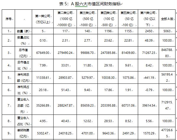 2022年,A股市場頭部效應(yīng)顯著,高市值上市公司經(jīng)營業(yè)績表現(xiàn)極為優(yōu)秀。將A股上市公司按照市值分成六大區(qū)間(見下表),數(shù)據(jù)顯示,千億市值以上的上市公司數(shù)量為122家,占比2.41%,市值規(guī)模達到34.71萬億元,占比40.99%。從盈利指標來看,千億級上市公司的營業(yè)收入總額達到32.35萬億元,占比45.38%;凈利潤總額達到4.02萬億元,占比71.61%。其中,萬億市值以上的上市公司有5家,分別為貴州茅臺、工商銀行、建設(shè)銀行、中國移動、農(nóng)業(yè)銀行,其合計總市值、營業(yè)收入、凈利潤分別為6.76萬億元,3.53萬億元和1.13萬億元,占A股上市公司相同指標總額的比重分別為7.99%、4.95%和20.18%;其平均凈利潤和營業(yè)收入分別達到2267.72億元和7053.38億元,均遠超其他類別的上市公司。