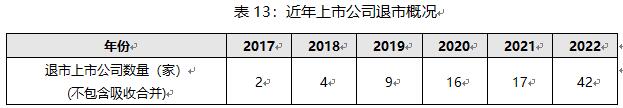 2022年,A股市場共計退市42家上市公司,創(chuàng)下退市數(shù)量新高,其中,有24家上市公司因被*ST后首個會計年度被會計師事務(wù)所出具無法表示意見或者否定意見的審計報告而退市,“非標退市”已經(jīng)成為推動資本市場優(yōu)勝劣汰中非常重要的一環(huán),1家上市公司因連續(xù)20個交易日的每日股票收盤價均低于人民幣1元而被退市。板塊情況來看,不同板塊退市公司數(shù)量分別為滬主板18家、深主板16家、創(chuàng)業(yè)板8家。行業(yè)情況來看,退市公司數(shù)量最多的前4個行業(yè)分別為傳媒(7家)、非銀金融(4家)、醫(yī)藥生物(3家)、社會服務(wù)(3家)。隨著注冊制改革的進一步深化,可以預(yù)見上市公司退市將逐步常態(tài)化,上市公司只有堅守合規(guī)底線,才能保證基業(yè)長青。
