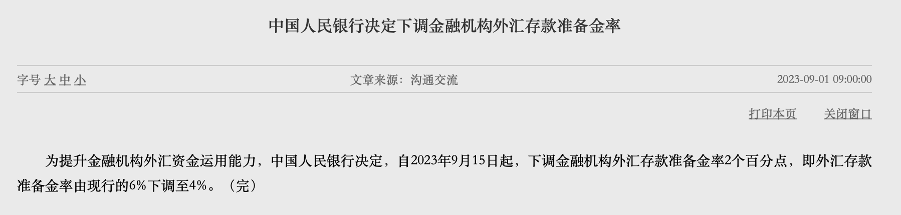 為提升金融機構外匯資金運用能力,中國人民銀行(下稱“央行”)決定,自2023年9月15日起,下調金融機構外匯存款準備金率2個百分點,即外匯存款準備金率由現行的6%下調至4%。