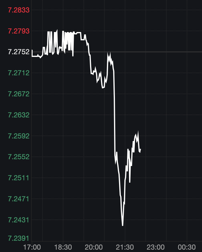 自9點宣布下調金融機構外匯存款準備金率公告發布后,據Wind數據顯示,更多反映國際投資者預期的離岸人民幣對美元匯率快速走高,從7.2665升破7.24關口僅用了約17分鐘,隨后有所回調。截至記者發稿,匯率圍繞7.25附近波動。