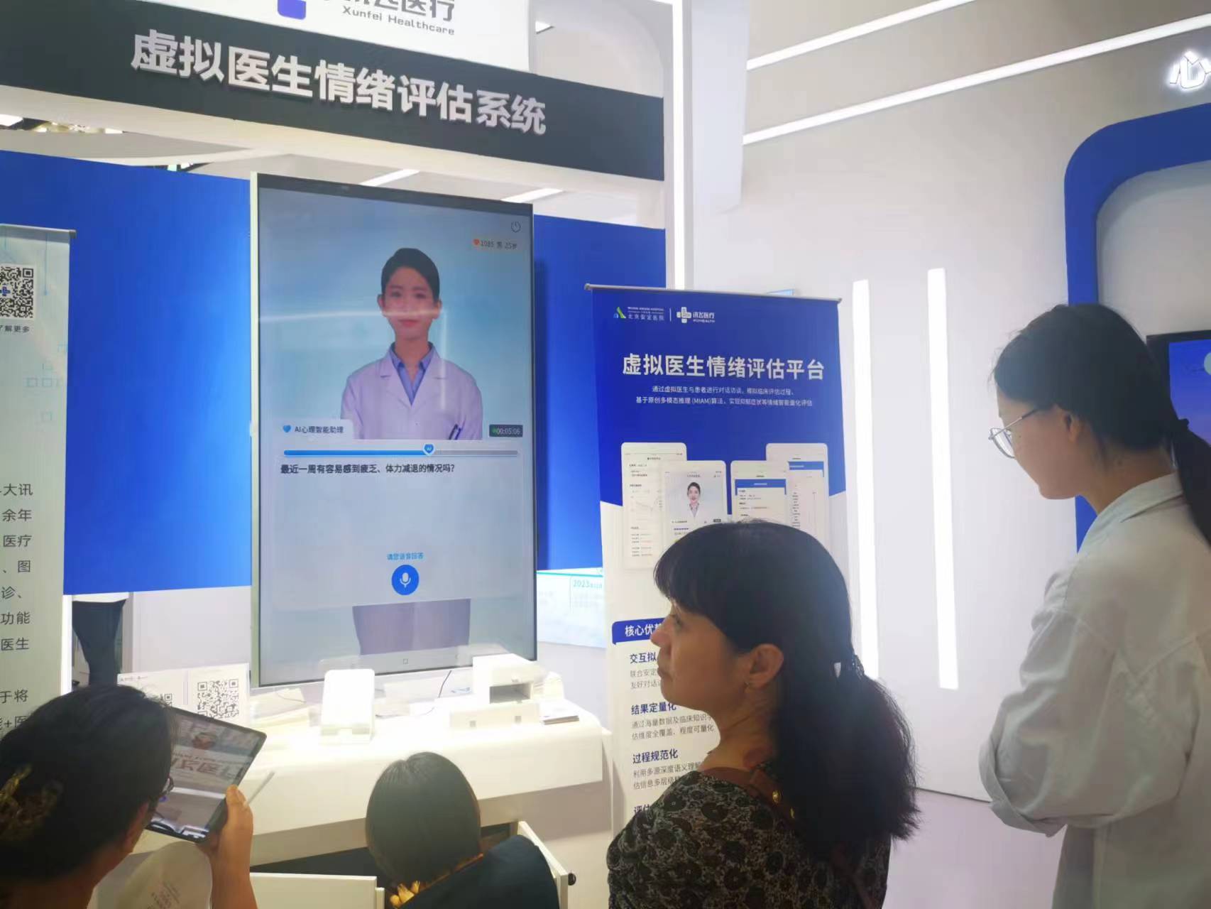 在訊飛醫(yī)療展臺虛擬醫(yī)生情緒評估平臺前,虛擬醫(yī)生正在進行對話訪談,身穿“白大褂”的虛擬醫(yī)生,不僅擁有逼真的外觀形象,還可以基于醫(yī)療大模型等技術,實現(xiàn)個性化友好對話訪談。通過虛擬醫(yī)生與患者進行對話訪談,可以大大減輕患者心理壓力,模擬臨床評估過程,實現(xiàn)抑郁癥狀等情緒智能量化評估。