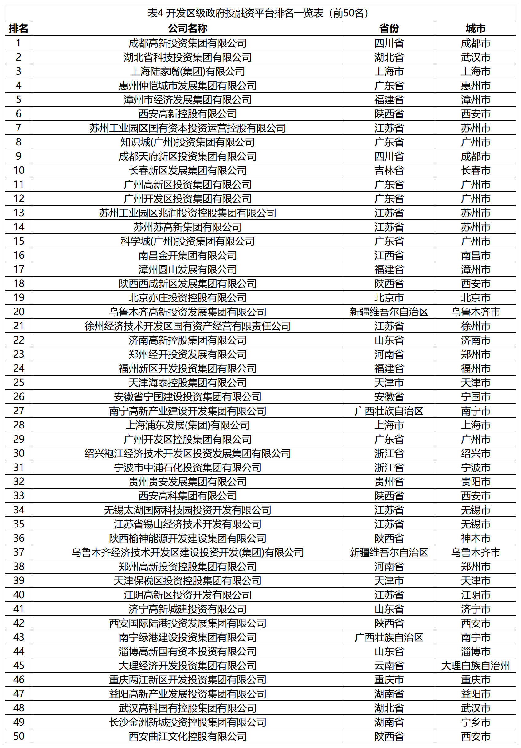 作為該書的重要一部分,該書公布了全國地方政府投融資平臺轉型發展評價結果。其中,四川發展(控股)有限責任公司、南昌市交通投資集團有限公司、閩西興杭國有資產投資經營有限公司、成都高新投資集團有限公司分別位居省級、地市級、區縣級、開發區級榜單第一名。
