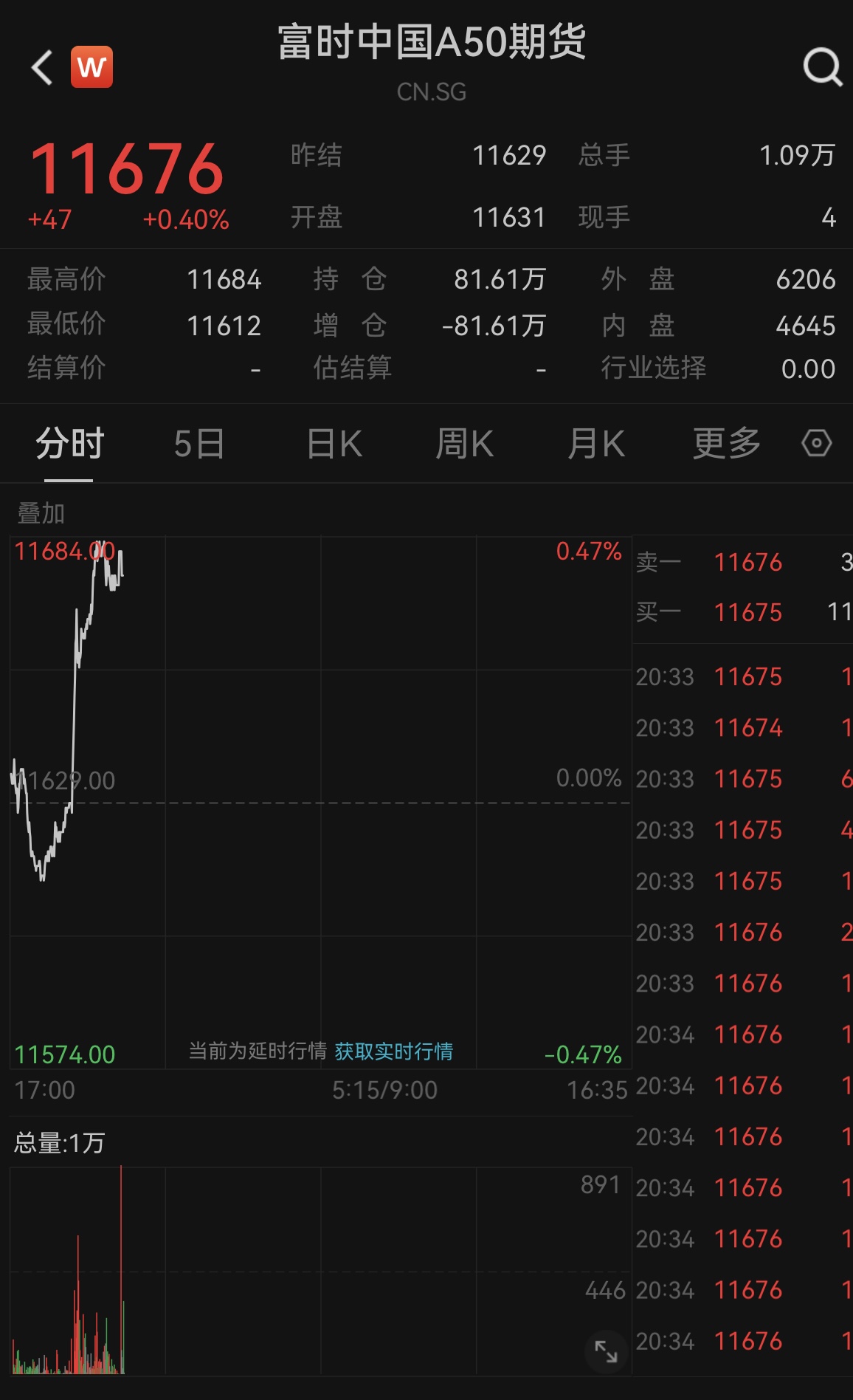 公告發布后,富時中國A50指數期貨短線急速拉升,截至記者發稿,富時中國A50指數期貨上漲0.40%。