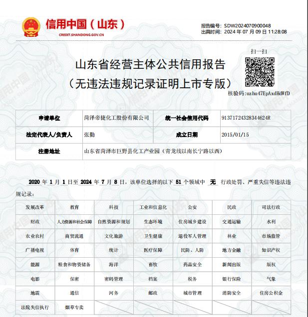 (圖片說明:菏澤帝捷化工股份有限公司取得菏澤市第一份上市專版公共信用報(bào)告)