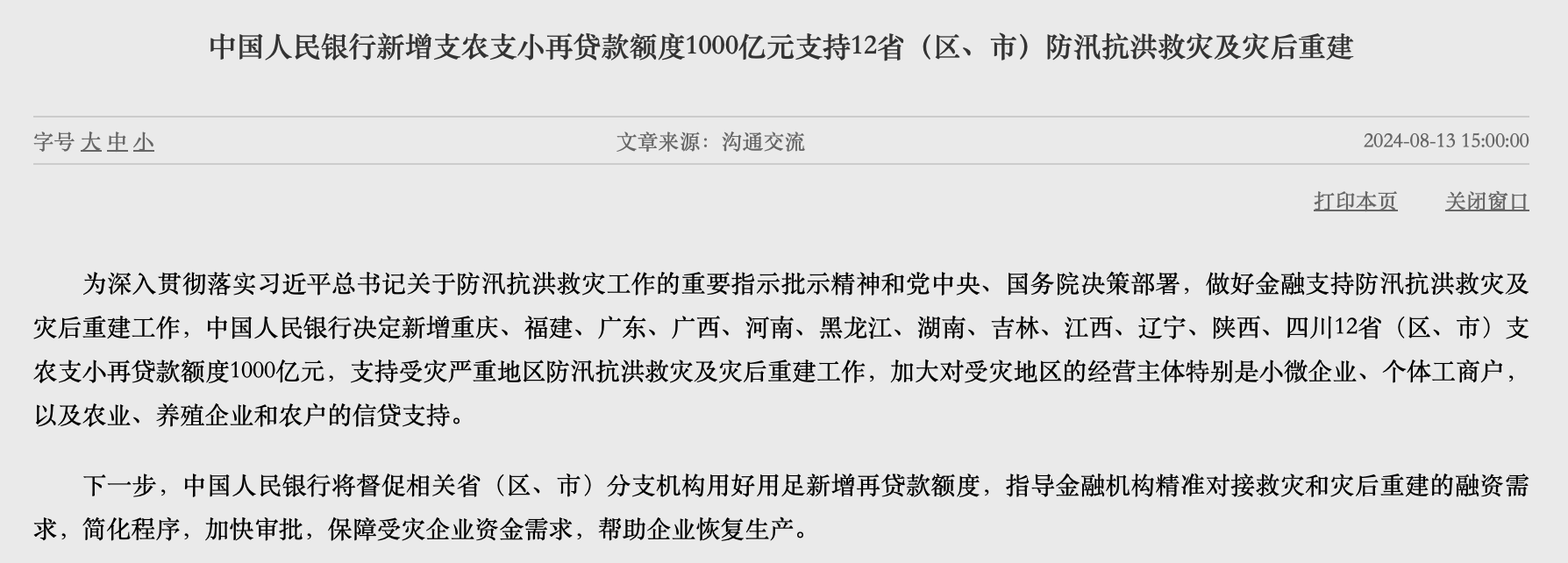 本報訊 (記者劉琪)8月13日,中國人民銀行發布消息,為深入貫徹落實習近平總書記關于防汛抗洪救災工作的重要指示批示精神和黨中央、國務院決策部署,做好金融支持防汛抗洪救災及災后重建工作,中國人民銀行決定新增重慶、福建、廣東、廣西、河南、黑龍江、湖南、吉林、江西、遼寧、陜西、四川12省(區、市)支農支小再貸款額度1000億元,支持受災嚴重地區防汛抗洪救災及災后重建工作,加大對受災地區的經營主體特別是小微企業、個體工商戶,以及農業、養殖企業和農戶的信貸支持。
