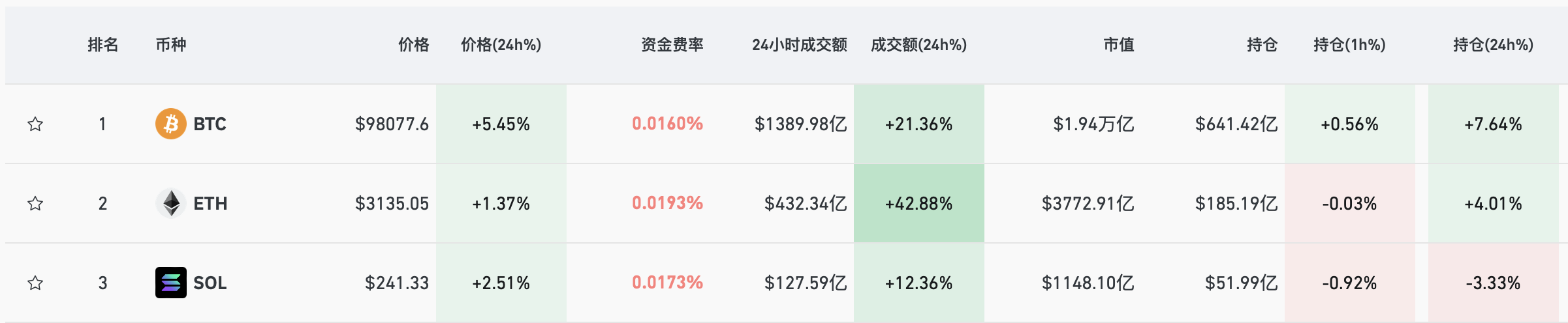 本報訊 (記者田鵬)11月21日,截至記者發稿,比特幣升破98000美元/枚的高位,日內上漲5.4%,且漲勢不減,正加速向10萬美元/枚邁進。