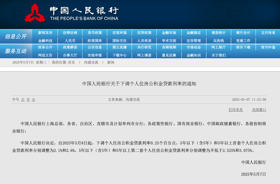 本報(bào)訊 (記者韓昱)中國人民銀行5月7日發(fā)布《中國人民銀行關(guān)于下調(diào)個(gè)人住房公積金貸款利率的通知》(以下簡稱《通知》)。《通知》稱,中國人民銀行決定,自2025年5月8日起,下調(diào)個(gè)人住房公積金貸款利率0.25個(gè)百分點(diǎn),5年以下(含5年)和5年以上首套個(gè)人住房公積金貸款利率分別調(diào)整為2.1%和2.6%,5年以下(含5年)和5年以上第二套個(gè)人住房公積金貸款利率分別調(diào)整為不低于2.525%和3.075%。