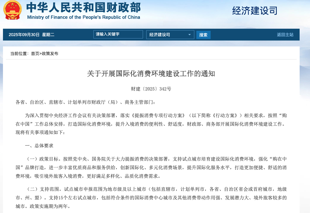 同日,財政部、商務部還發布了《關于開展國際化消費環境建設工作的通知》(以下簡稱《通知》),明確為更好發揮消費在穩增長、惠民生中的重要作用,更好滿足多樣化、品質化消費需求,助力擴大入境消費,將在全國選取15個左右試點城市,開展國際化消費環境建設工作。試點城市范圍包括符合條件的國際消費中心城市及其他消費帶動作用強、發展潛力大、境外旅客較多的地市級及以上城市。
