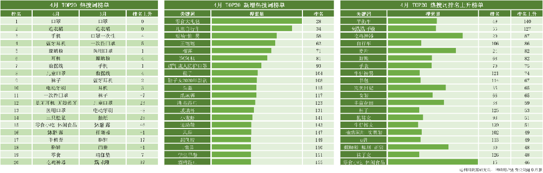 數據顯示,口罩依然位居“TOP20熱搜榜”首位,連衣裙緊隨其后。兒童自行車、頭盔、運動鞋等戶外活動相關搜索詞,首次躍升入“TOP20新增熱搜詞榜單”。平衡車、自行車、防曬霜、雨傘等戶外活動相關配套的搜索量也顯著上升。其中,平衡車名次環比上升了140位,成為4月熱度上升最快的熱搜詞。3C數碼相關的搜索熱度增速顯著,手機、耳機、數據線、手機殼等相關搜索詞占比高達35%。其中,相機訂單量環比上升了85.37%。