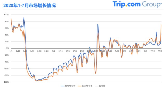 在會上,攜程調取了2019年1月1日起至2020年7月31日的全部數據,對湖南疫情前后酒店數據進行回顧與預測。數據顯示,疫情發生后,湖南酒店預定量呈斷崖式下跌,直到2月才逐漸有所回升,4月30日起開始超過去年平均值。5月開始,酒店預定開始趕超去年,尤其是7月,增長率達到14.43%。