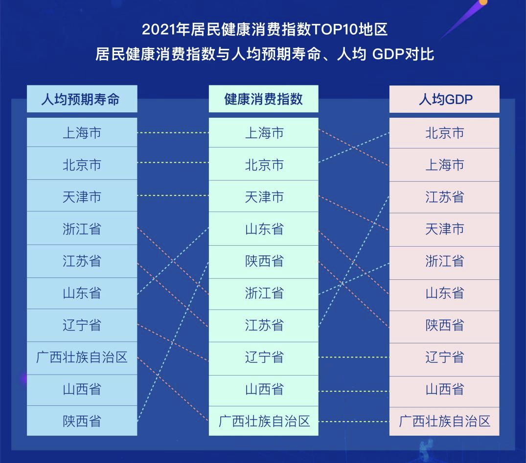 該指數旨在使用消費大數據衡量不同地區居民消費習慣對居民健康的影響,通過測算不同地區居民平均每日消耗煙酒、蔬菜瓜果和肉蛋奶等商品以及經常參與體育鍛煉比例的具體數值,參考權威醫學實證研究得出上述消費行為對于健康的影響系數,進而推算得來。