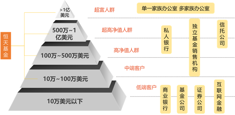 從客戶覆蓋來看,恒天基金作為頭部獨立高端理財服務機構,相比私行、信托覆蓋客戶范圍更廣。從中端客戶一直到超富人群,恒天基金幾乎做到全資產類別的覆蓋,提供滿足不同客戶的財富管理方案。