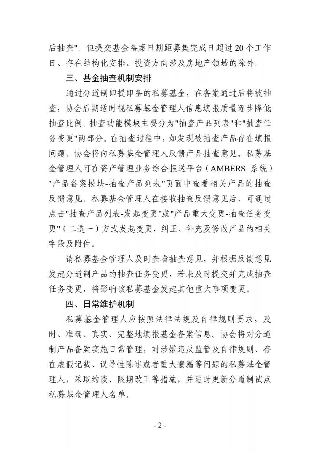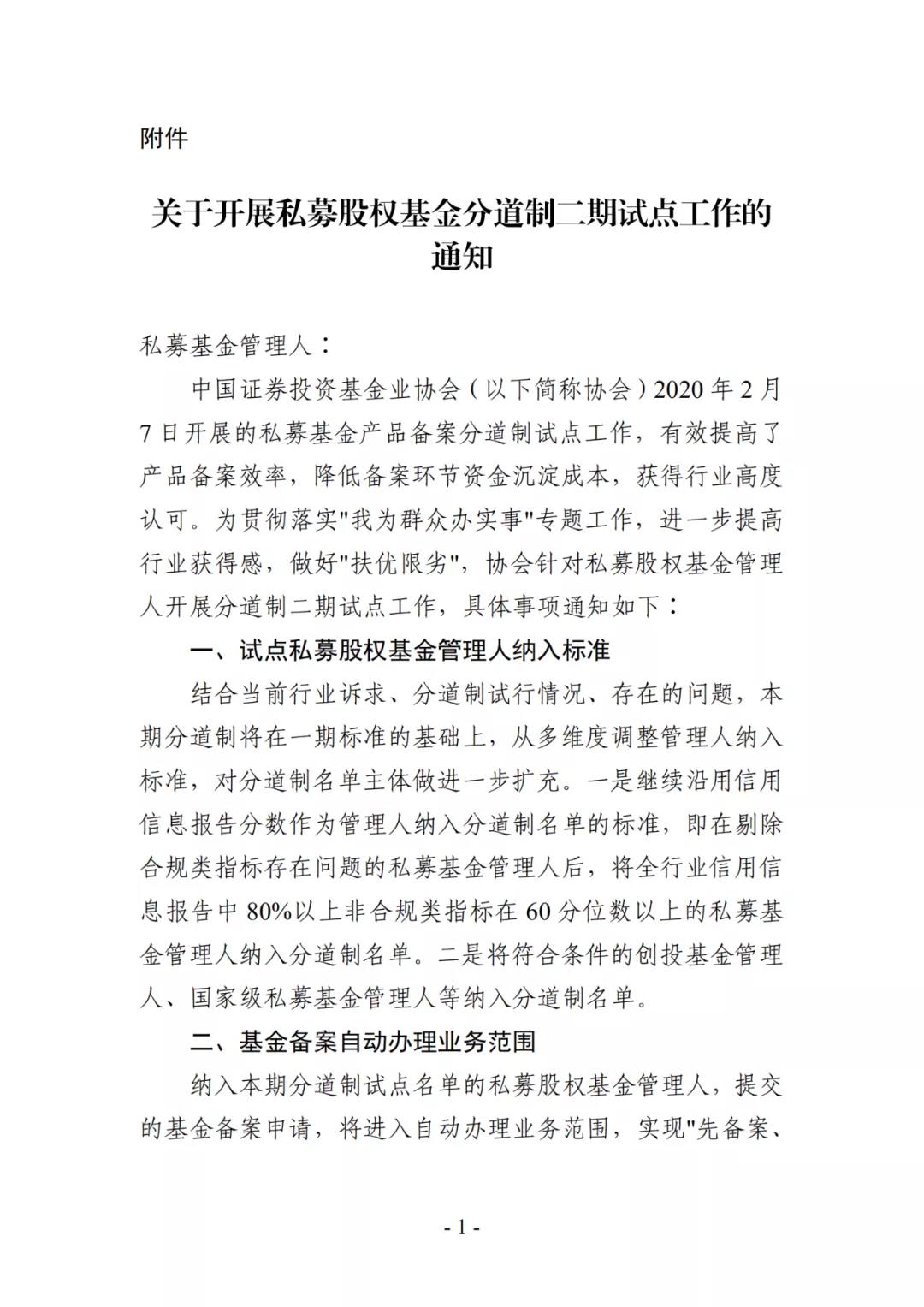 以下為中基協《關于開展私募股權基金分道制二期試點工作的通知》原文: