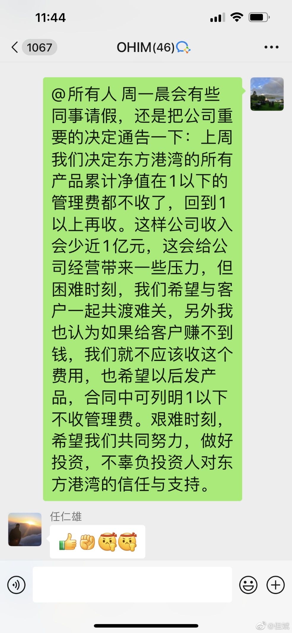 但斌還表示,“另外,我認為如果客戶賺不到錢,我們就不應該收這個費用,也希望以后發產品,合同中可列明1以下不收管理費。目前我們正在與各渠道溝通協調,艱難時刻,希望我們共同努力,做好投資,不辜負投資人對東方港灣的信任與支持。”