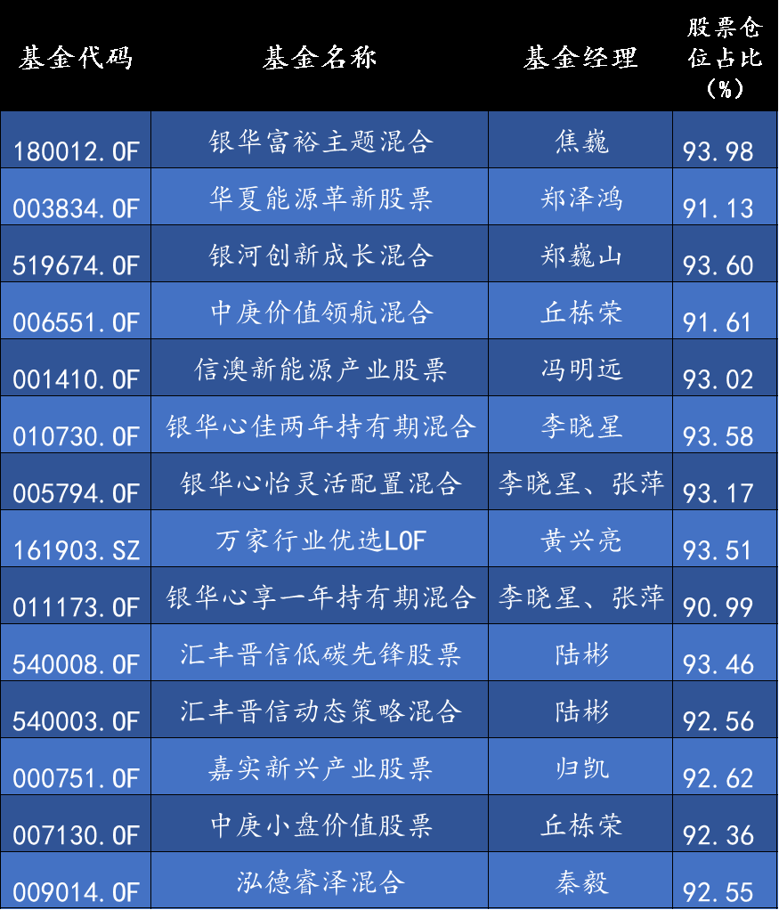 銀華基金焦巍旗下已披露的5只基金中,有4只三季度末的股票倉位高于90%。