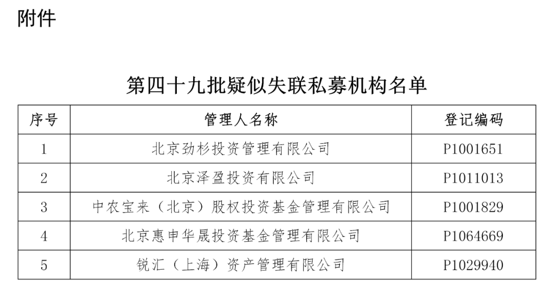 3月14日晚,中國證券投資基金業(yè)協(xié)會(huì)(以下簡稱“中基協(xié)”)發(fā)布公告稱,近期,中基協(xié)在日常工作中發(fā)現(xiàn)北京勁杉投資管理有限公司等5家疑似失聯(lián)私募機(jī)構(gòu),中基協(xié)通過該5家私募機(jī)構(gòu)在資產(chǎn)管理業(yè)務(wù)綜合報(bào)送平臺(以下簡稱“AMBERS系統(tǒng)”)中登記的固定電話、手機(jī)號碼、電子郵件等聯(lián)系方式無法與其取得有效聯(lián)系。