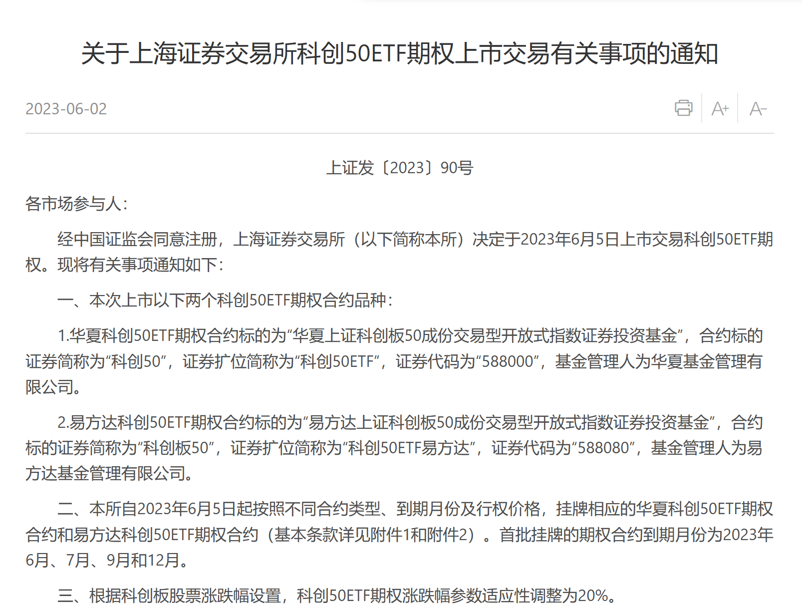 6月2日,上交所發布通知稱,經中國證監會同意注冊,決定于6月5日上市交易科創50ETF期權。