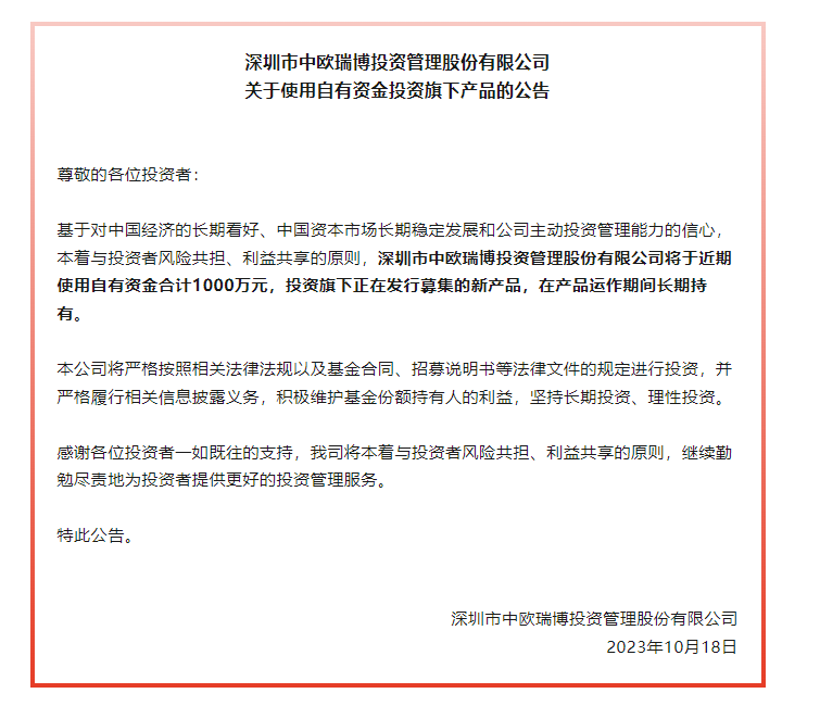 公告顯示,基于對(duì)中國(guó)經(jīng)濟(jì)的長(zhǎng)期看好、中國(guó)資本市場(chǎng)長(zhǎng)期穩(wěn)定發(fā)展和公司主動(dòng)投資管理能力的信心,本著與投資者風(fēng)險(xiǎn)共擔(dān)、利益共享的原則,中歐瑞博將于近期使用自有資金合計(jì)1000萬(wàn)元,投資旗下正在發(fā)行募集的新產(chǎn)品,在產(chǎn)品運(yùn)作期間長(zhǎng)期持有。