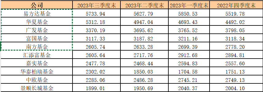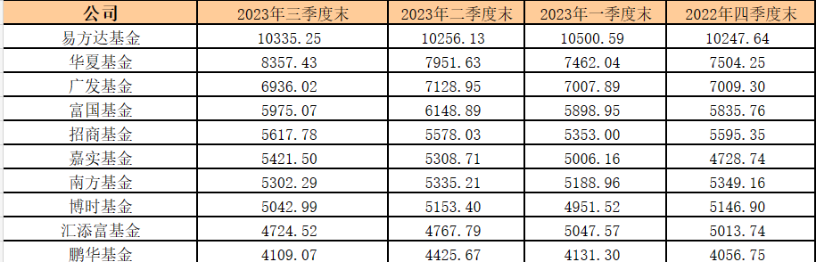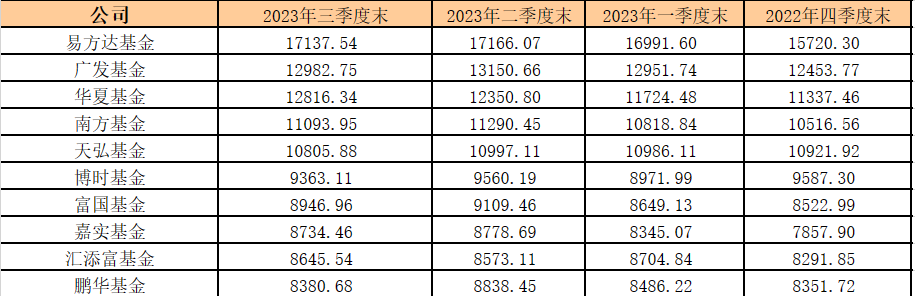 三季度前十大公募管理人總管理規模,單位:億元,數據來源:天相投顧