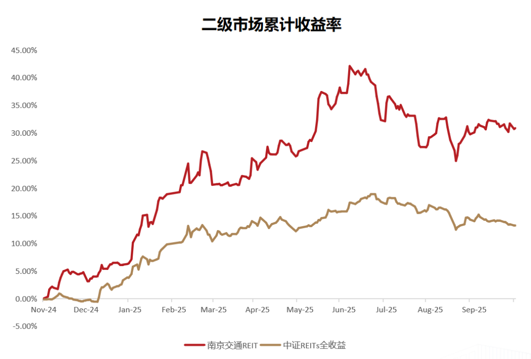 二級市場穩健顯優勢:截至2025年9月30日,產品上市以來二級市場漲幅為30.84%,本產品二級市場漲幅領先中證REITs全收益指數(13.18%),是投資者積極配置的優質標的,展現了市場對本產品經營能力對長期價值的認可。