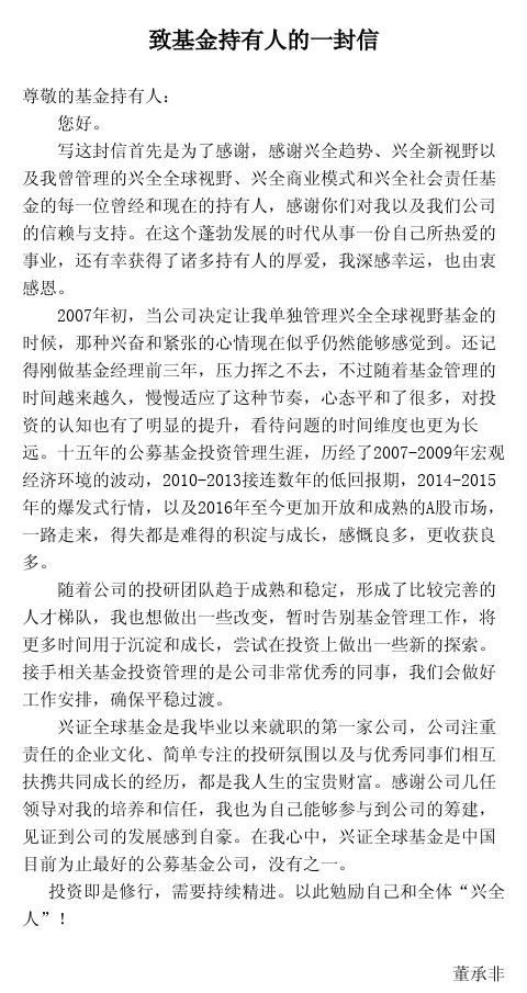 董承非在信中表示,寫這封信首先是為了感謝,感謝興全趨勢、興全新視野以及我曾管理的興全全球視野、興全商業(yè)模式和興全社會責(zé)任基金的每一位曾經(jīng)和現(xiàn)在的持有人,感謝你們對我以及我們公司的信賴與支持。在這個(gè)蓬勃發(fā)展的時(shí)代從事一份自己所熱愛的事業(yè),還有幸獲得了諸多持有人的厚愛,我深感幸運(yùn),也由衷感恩。